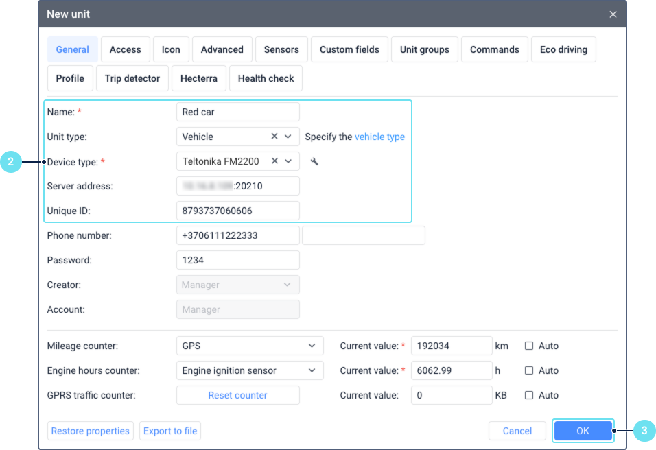 Specify the unit properties. To connect a unit to the system, you should fill in at least the following fields on the General tab: