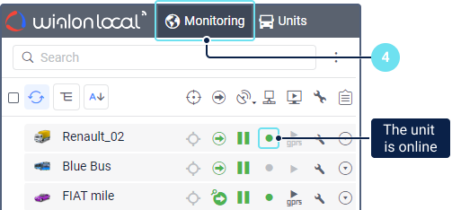Go to the Monitoring tab to which the created units are added automatically. Make sure the unit is connected and is sending messages to the system. In this case, a green marker is shown in its row in the Connection status column of the list.