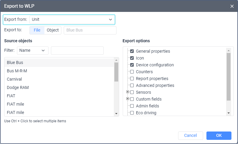 To export unit properties, select the Export to WLP item in the user menu and select Unit in the Export from drop-down list. See a detailed guide here.