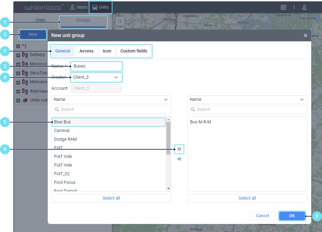 You can add the created units to groups. They allow you to group units according to certain criteria. In addition, you can use groups to grant access rights to several units at once. To do this, the creator of the group should have access rights to all the units added to it.