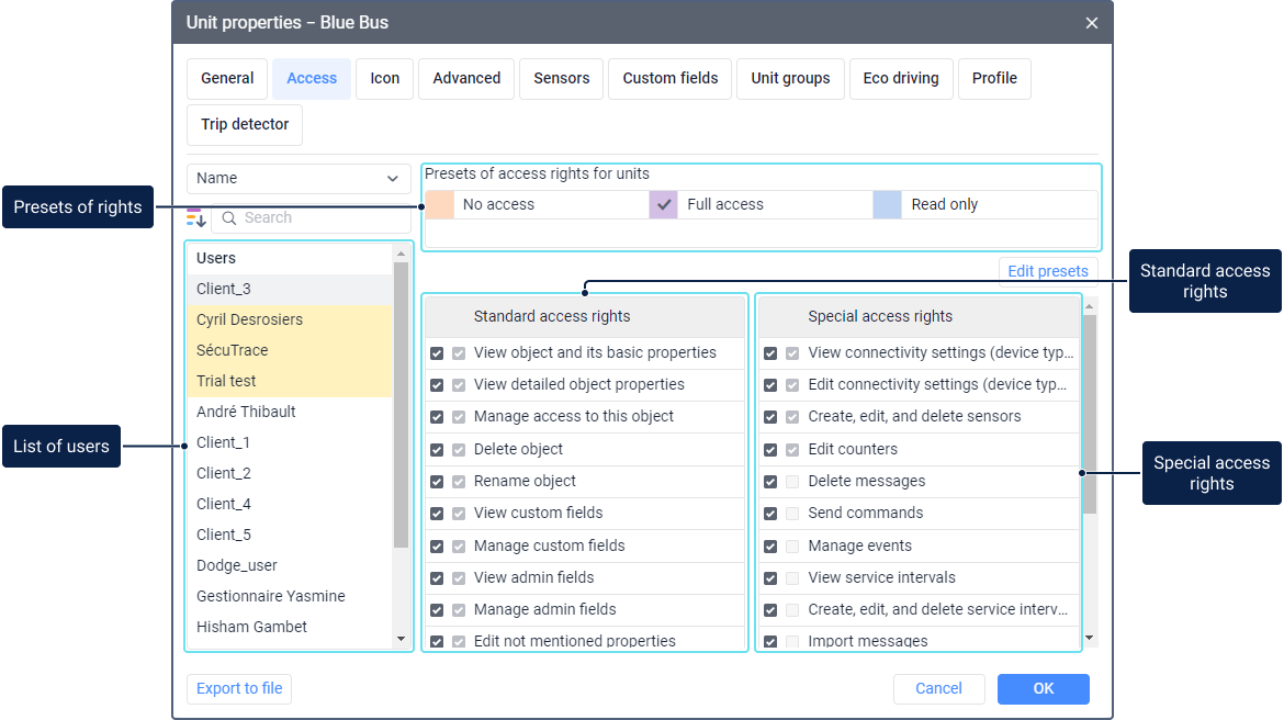 In the left part of the window, you can see the list of users to whom you can grant access rights to the unit. The names of users who have at least one of these rights are highlighted in color.