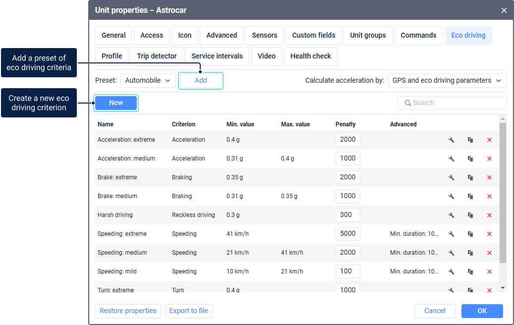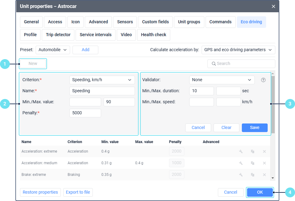 On this tab, you can select the method which should be used to calculate acceleration and add criteria which allow you to assess the quality of driving and detect violations. This is required in order to improve the safety of driving, maintain the quality of transported goods, and reduce fuel costs. For further information, see Eco Driving Control.