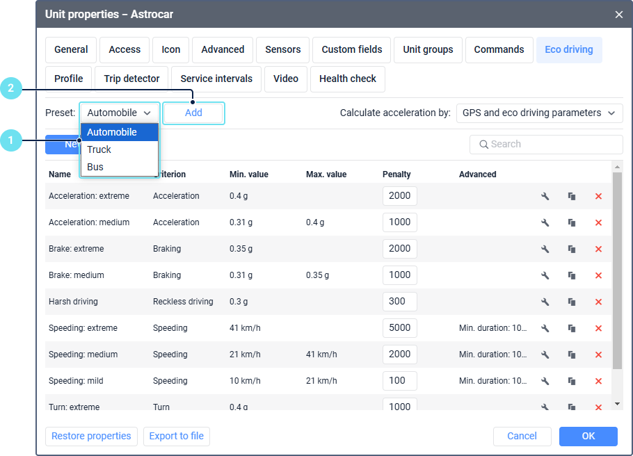 Depending on the vehicle type, you can add a list of criteria with the already configured parameters. To do this, select the required preset from the three available options (Automobile, Truck, Bus) and click Add.