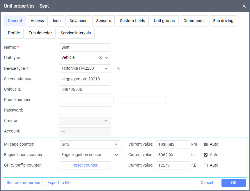 On the General tab, apart from other properties, you can configure the mileage, engine hours and GPRS traffic counters.