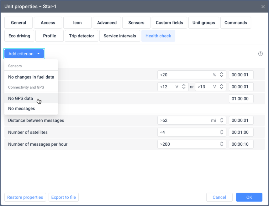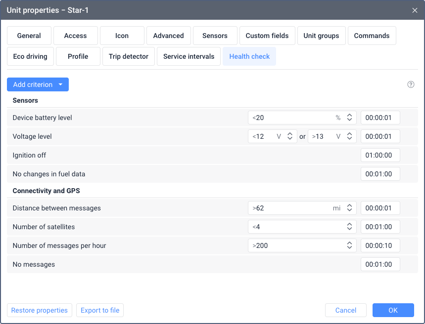 The criteria in this group are tracked based on a sensor configured in the unit properties.