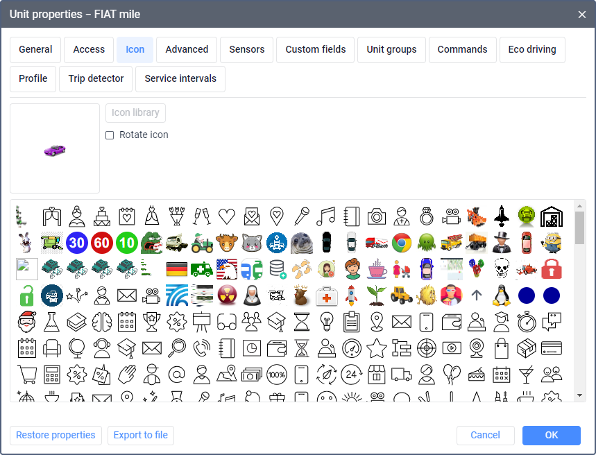 Users of top accounts have access to the Icon Library application, which allows uploading custom icons for units, unit groups, and geofences to the system. After uploading, the icons become available in the standard icon library in the upper part of the list.