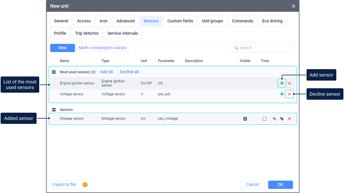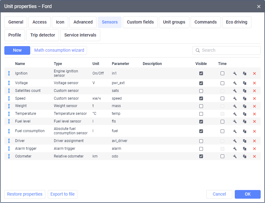 On this tab, you can create, copy, and delete sensors for the unit, configure their properties, visibility, and order. Also, the Math consumption wizard tool is available here.