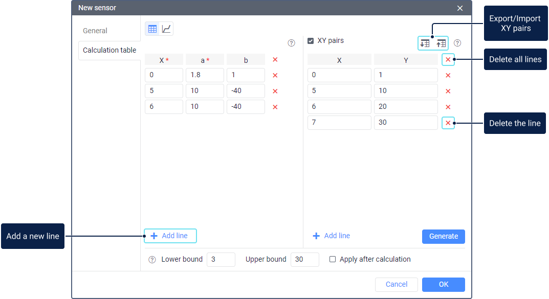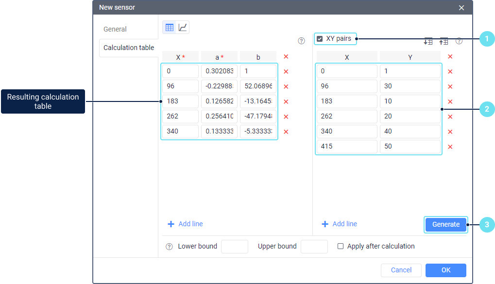 The XY pairs tool is designed to fill in the calculation table automatically. You can use this tool when calibrating sensor values experimentally. For example, you can pour different volumes of fuel into the tank and take the readings of the fuel level sensor corresponding to these volumes. See more information on how to make the calibration of a fuel tank in the guide.
