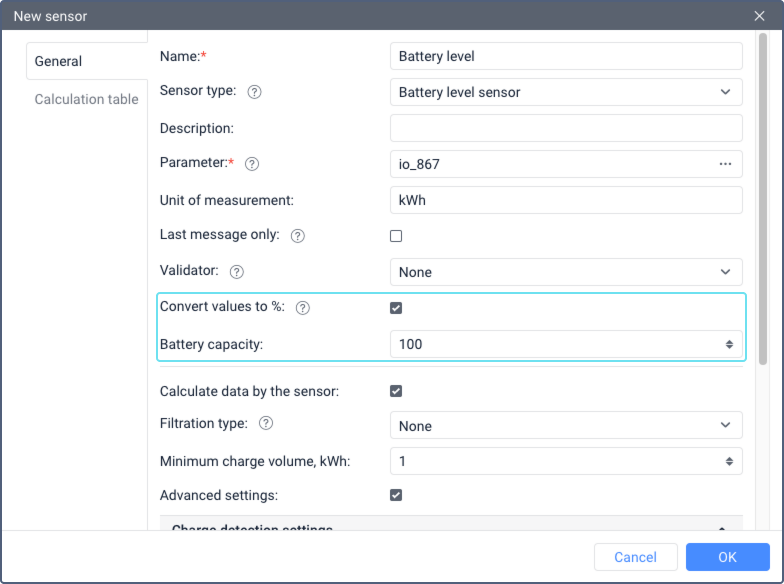 - In the sensor Parameter field, specify the parameter that sends the current battery level value in kWh, or use an expression or calculation table to set up the conversion of the value to kWh.