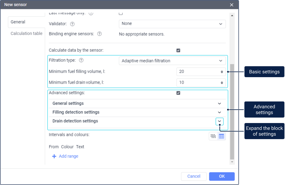 The fuel level sensor (FLS) has additional settings which are shown when the Calculate data by the sensor option is activated. These settings are divided into basic and advanced ones.