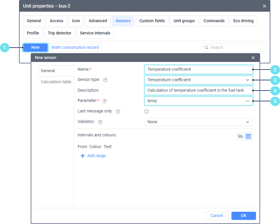 Any liquid can be compressed or expanded at different temperatures, so the readings of the fuel level sensor may not be accurate enough without taking into account the temperature in the fuel tank or, for example, in the fuel tanker. In this case, to get more accurate calculations of the fuel level, you should also create a sensor of the Temperature coefficient type. It allows calculating the temperature coefficient based on the parameter in which temperature or voltage data is received.
