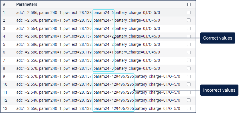 Let’s analyse the param24 temperature parameter in the image below. You can see that when the temperature drops and the threshold of 0 degrees is crossed, incorrect values are displayed.