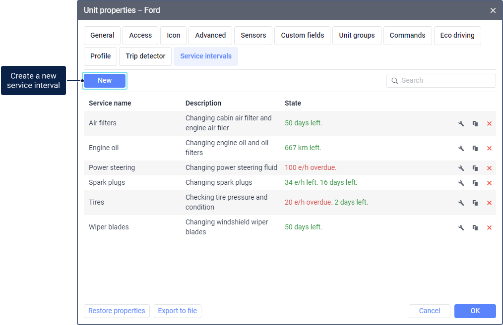 On this tab, you can create, edit, and delete service intervals of the vehicle. Before getting started, see the basic concepts.