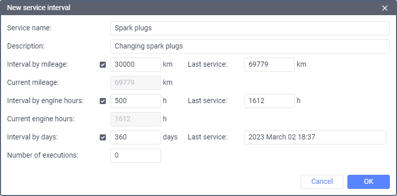 | Interval by mileage | Enable this option and specify the number of kilometers after which the service should be carried out again. In the Last service field, specify the mileage value at which the service was carried out last time. |