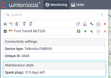 All the created service intervals and their execution state can be shown in the unit tooltip and in the extended unit information on the Monitoring tab.