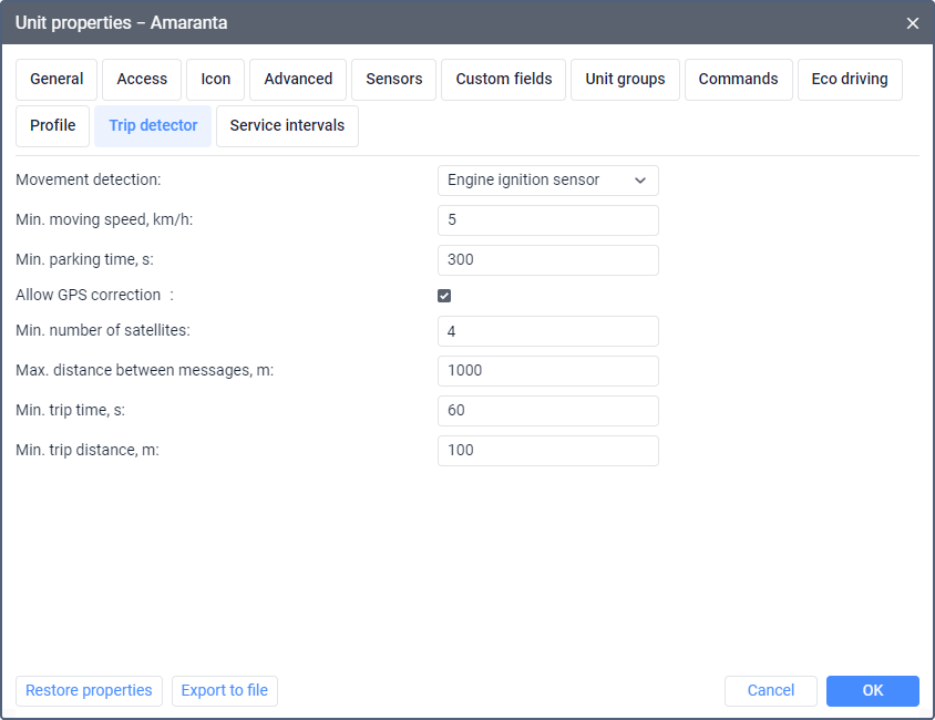 The parameters of the trip detector are used to determine movement, trip, stop and parking intervals.