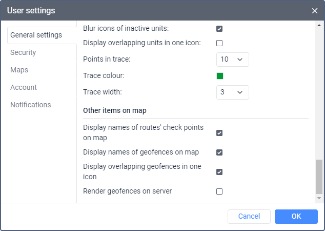 In this section, you can configure the way route check points and geofences are displayed on the map.