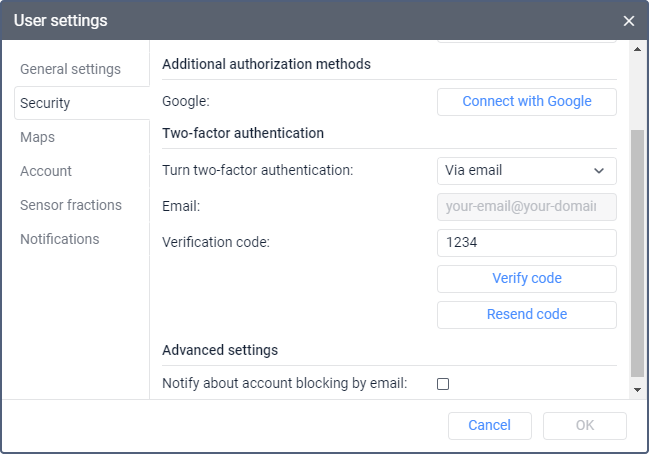 After confirming the e-mail address, you must enter the code sent to this address each time you log in to the monitoring system.
