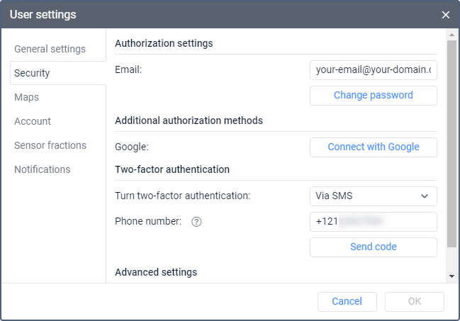 After confirming the phone number, you must enter the code sent to this number each time you log in to the monitoring system.
