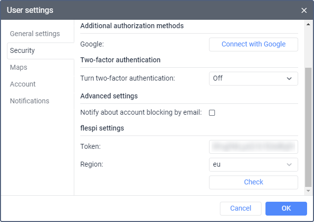 The field with the generated token is displayed after successful authorization in flespi. The token is valid for one year. To see the information about the status (active/expired) and the expiration date of the token, click on the Check button. If necessary, you can edit the token manually.