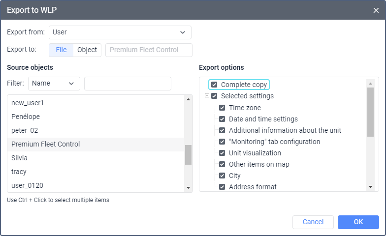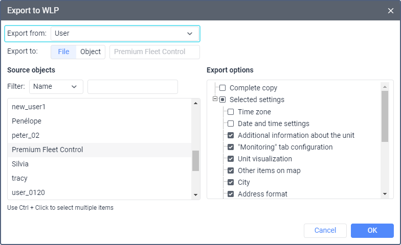 To export user settings, select the Export to WLP item in the user menu and select User in the Export from drop-down list. See a detailed guide here.