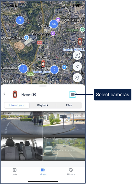 On this tab, you can watch live streams from the unit cameras, monitor the unit movement on the map, and configure cameras.