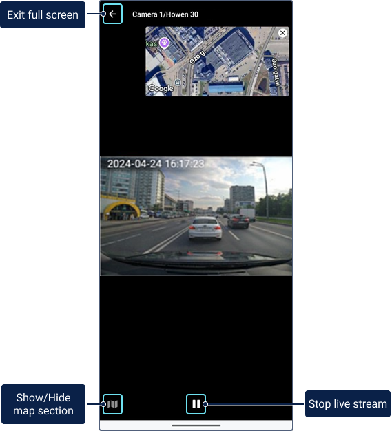 Double-tap the section of the required live stream to open it in full screen. In the full-screen mode, the map section is also available, in which you can see the unit location. If necessary, you can move this section to the right or left in the upper or lower part of the screen.