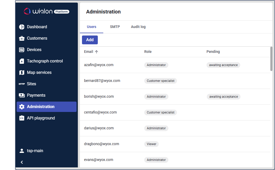 The Administration page is available in Wialon Platform Studio and allows you to: