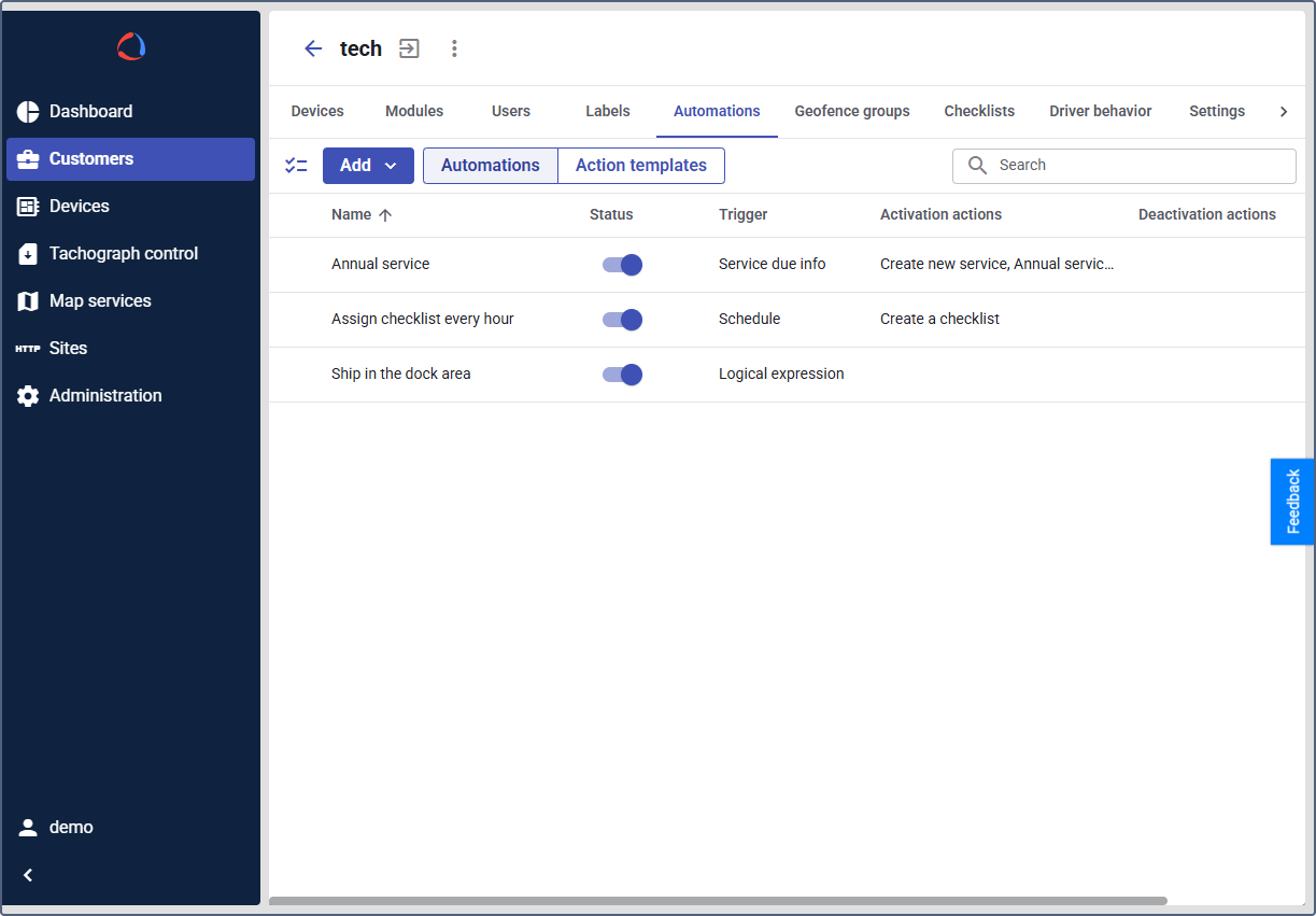 The Automations module is a powerful monitoring tool that allows you to keep track of any significant event occurring within your customers’ fleets.