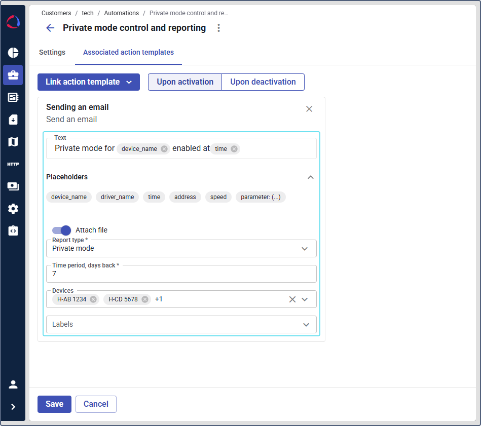 - Labels: Select the labels you want to include in the report. The attached report will include the devices with these labels. If you select labels and devices above, both devices and devices with the labels are included in the report. To generate a report for the labels selected in the automation settings, leave this field blank.