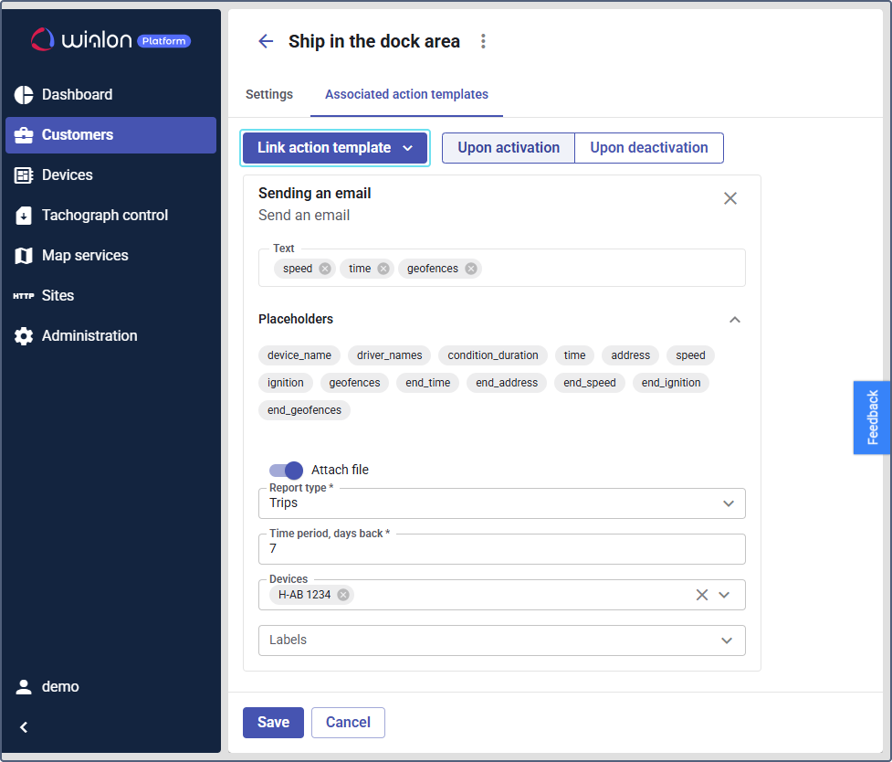 - In the Text field, use the available placeholders to include dynamic information in the text, such as speed, time, and geofences. See the detailed guide on placeholders in the Using placeholders in the text message section.