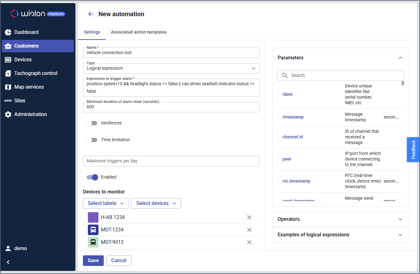 If any of the defined conditions are detected, an online notification will be displayed to the customer in Wialon Platform FleetSpace.