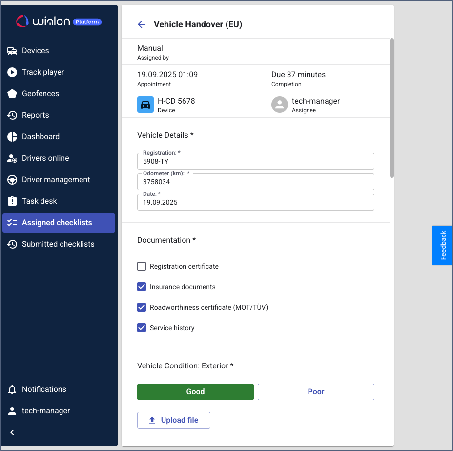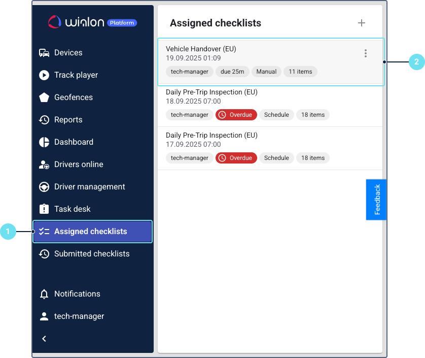 Customer users can view and complete assigned checklists directly within the Wialon Platform FleetSpace web interface.