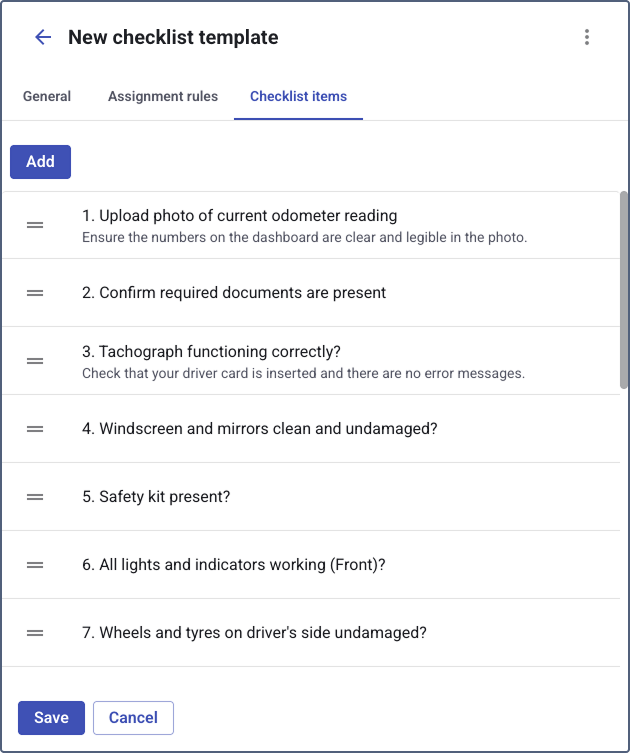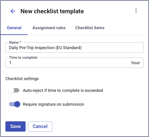 - Time to complete: Specify the maximum expected time for a driver to complete the checklist, entered in hours (for example, enter