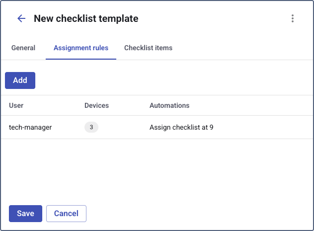 You can create a checklist template without configuring assignment rules. Omit this step if you want to assign checklists manually or configure the assignment rules later.