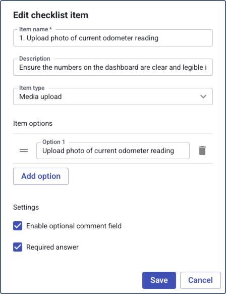 for fail). - Settings: Make the item required, and choose to enable optional comments or media uploads if needed.