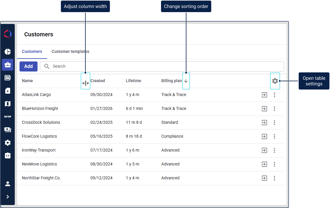 In Wialon Platform Studio, the created customers are displayed in the customer table. You can manage it using the following actions: