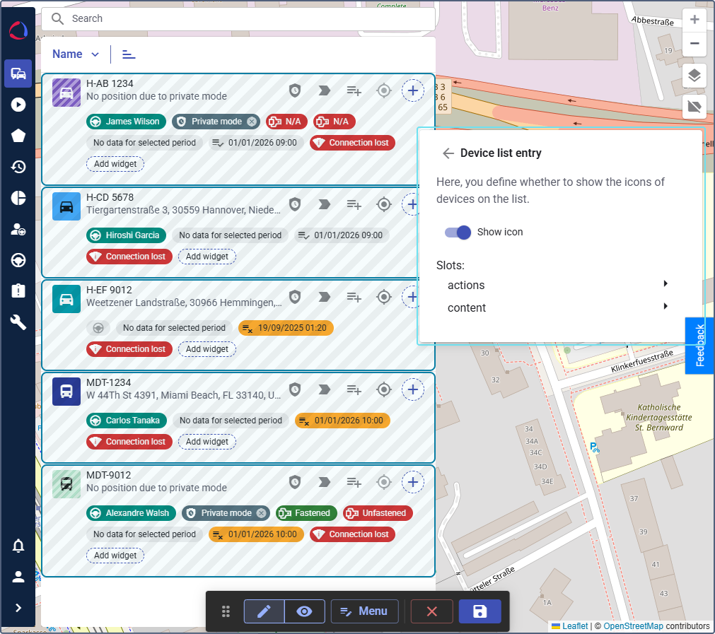 Click on any device row to customize the appearance of individual entries in the device list via the Device list entry settings. Enable or disable the Show icon toggle to control the visibility of the specific device type icon.