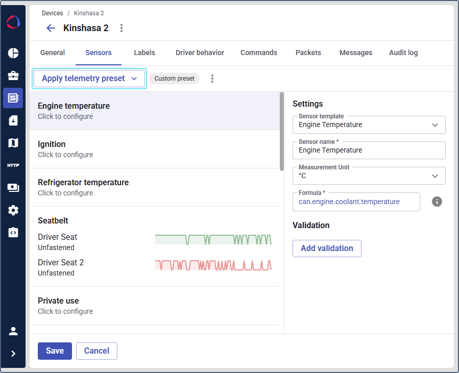 (Optional): After applying the preset, you can modify the sensor settings. Modifying the sensor settings doesn’t affect the telemetry preset. If you want to save these new configurations for future use, click the icon