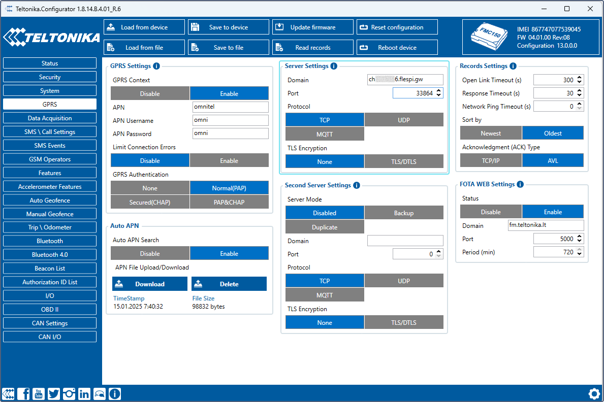 2. In Teltonika Configurator, on the GPRS tab, locate the Server settings section.