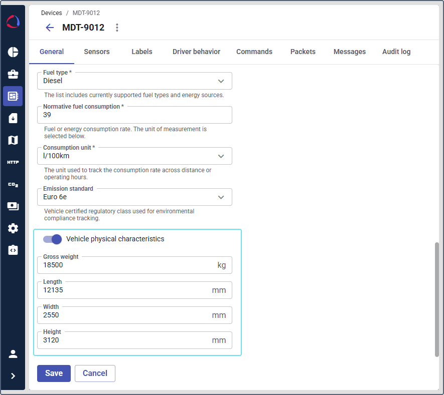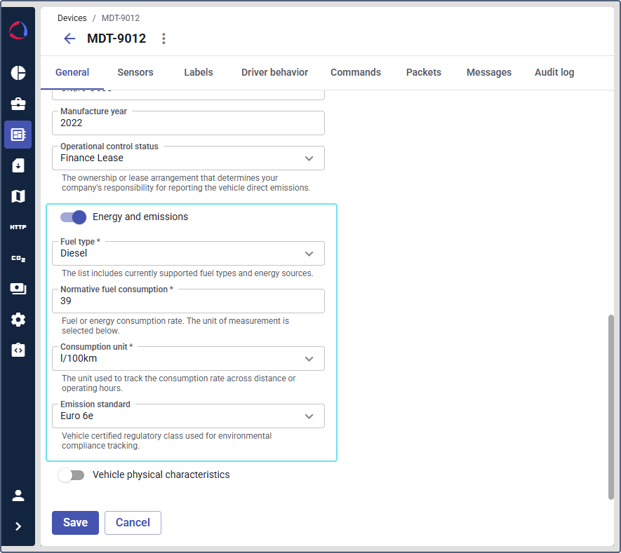 - Normative fuel consumption (required): The fuel or energy consumption rate for the device. Enter the numeric value; the unit of measurement is selected in the Consumption unit field below. Use the value from your operational experience or the vehicle manufacturer’s technical specifications. This value is used to estimate emissions when the fuel volume sensor isn’t configured or doesn’t provide sufficient data.