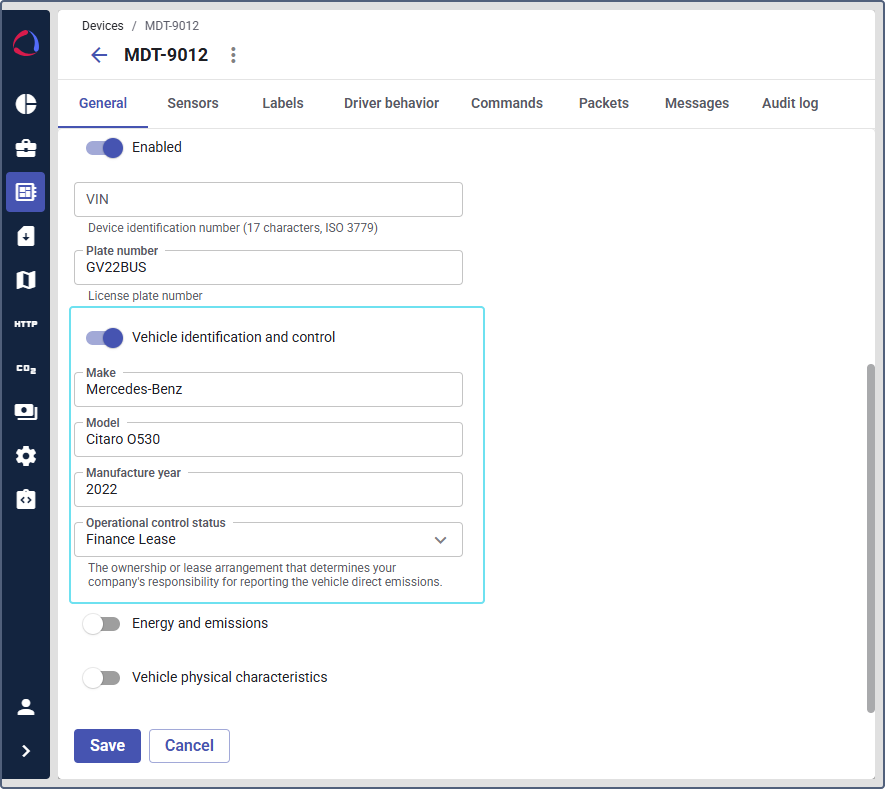 To show extended vehicle fields, enable the Vehicle identification and control toggle and provide the following information: