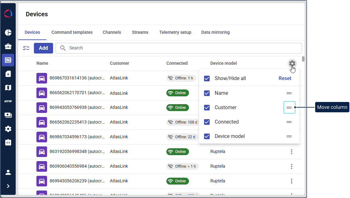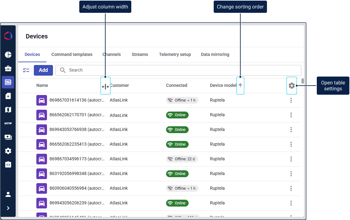 You can sort the devices by name, customer, and device model. To do so, click on the necessary column header. For a descending sorting order, click on the header again.