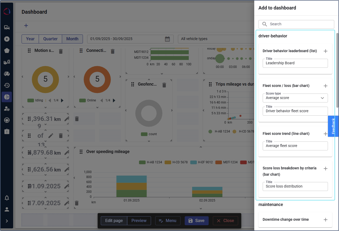 Configuring driver behavior widgets for Dashboard
