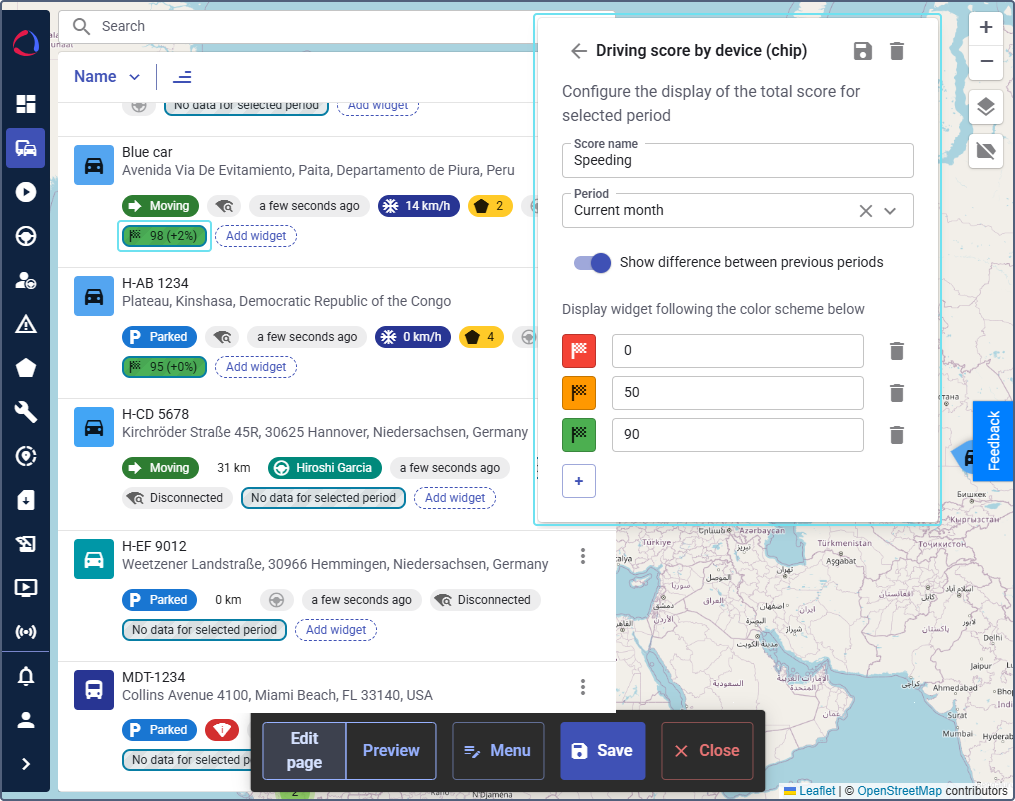 On the Devices page, you can add the Driving score by device chip to the device list and various widgets to the device details.