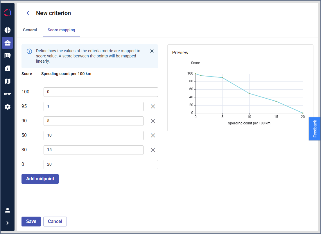 Click Add midpoint to add intermediate points to the mapping. This allows you to create more complex, multi-stage scoring rules instead of a simple linear scale.