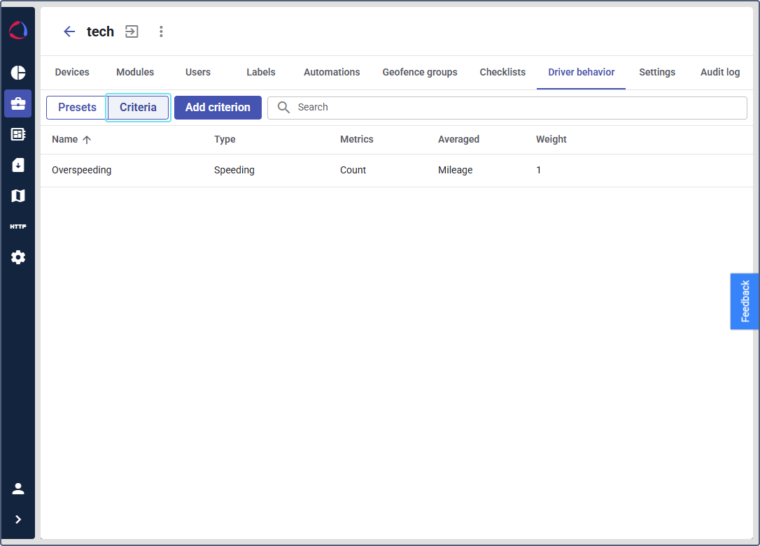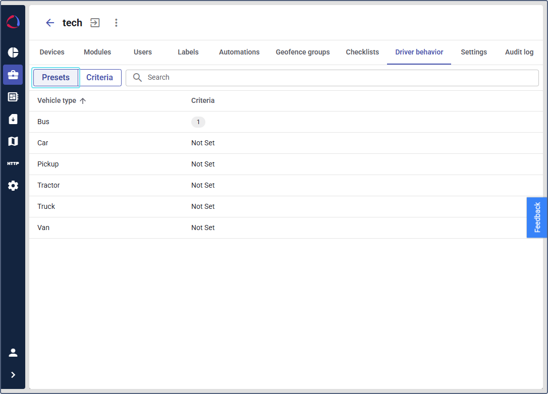 - In the top navigation bar, click the Driver behavior tab. By default, you’ll be in the Presets view.