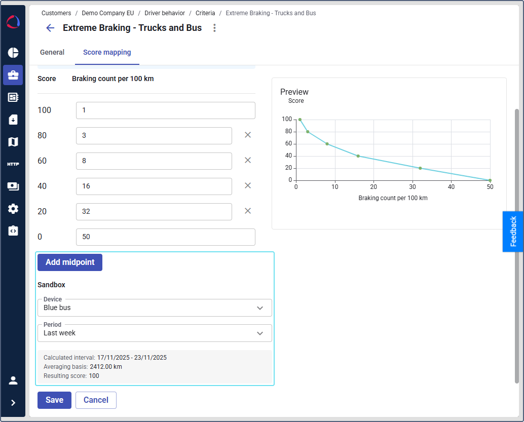For example, the resulting score is 100 which means the driver had 0 or 1 extreme braking events per 100 km over the 2412.00 km distance driven.