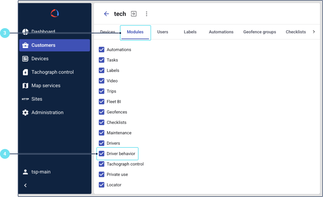 To enable the Driver behavior module for a customer:
