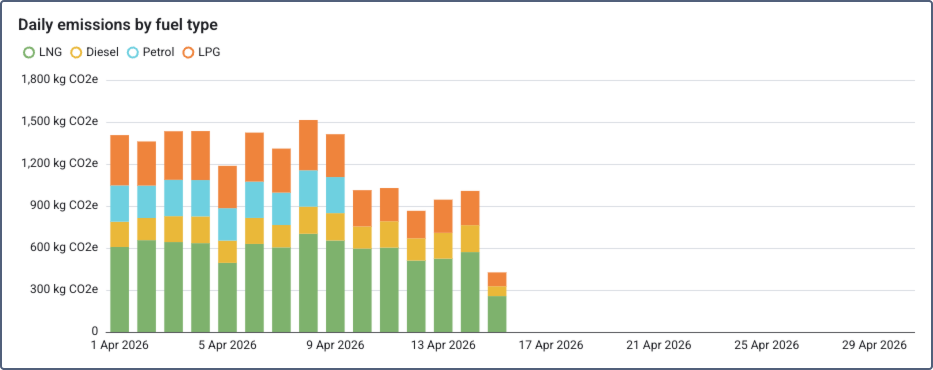 Emissions by fuel type (bar chart): Shows the distribution of calculated CO2e emissions across fuel types (for example, diesel, petrol, electric) for the selected time period. This helps identify which fuel types contribute the most to fleet emissions and evaluate the impact of transitioning to lower-emission energy sources.